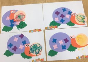 かわいいかたつむりの渦をペンで描きアジサイの花は貼りつけて、霧吹きで雨のように降らして子ども達のかたつむりが、ほんのり馴染んでいました。素敵な作品が出来上がりました。