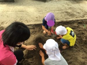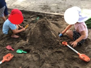 2グループに分かれて、お友達と力を合わせて山を作りました