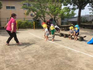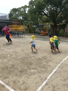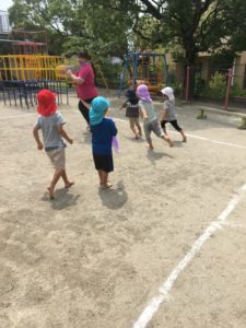 最後は、先生からがしっぽをつけて園庭全体で、今日もたくさん身体を動かしてあそびました。しっぽ取りを楽しみました。