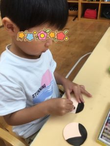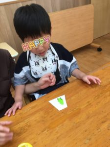 今日のリス組さんは、七夕製作をしました。折り紙で、織り姫、彦星の服をつくりました。
