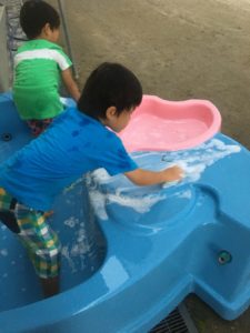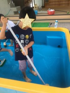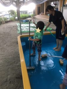おかげで綺麗にプールになりました。お手伝いをして、褒められてみんな楽しそうで、笑顔いっぱいの年長さんでした。