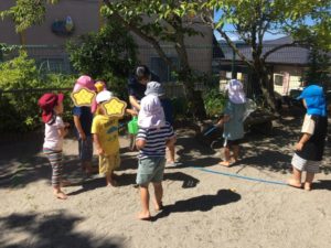 ミーンミーン。園庭に蝉の声が響いています。自由遊びには、虫取りをおこなっています。