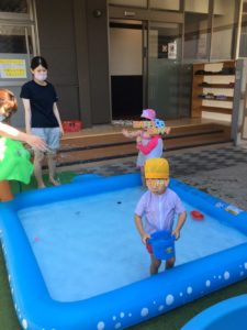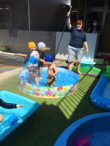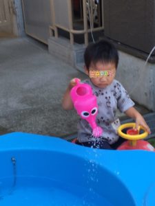 ジョウロや、ホースを使ってシャワーをみんなでかけてお気に入りのおもちゃで遊んで楽しんでいました。