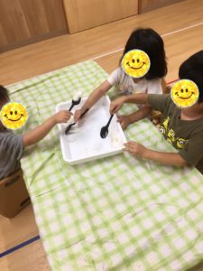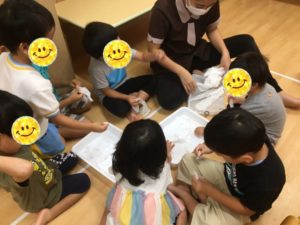 ティッシュをみんなで細かくちぎっていきます。