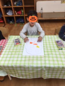 なかなか難しいですが、丸や四角など色どり豊かなクレヨンで描いていきます。
