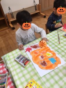 紅葉とイチョウの葉っぱを貼って出来上がりです‼