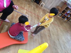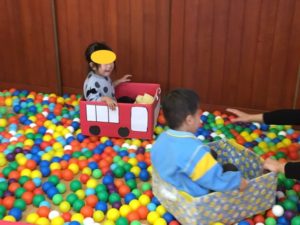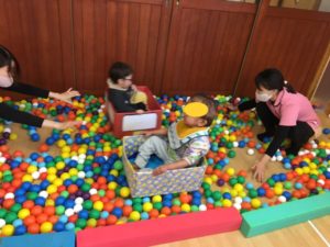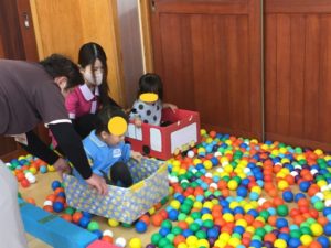 くま組では、カラーボールをいっぱいに広げて、道路⁉️が完成❣️その上を箱車に乗ったお友達が往来しています😀
