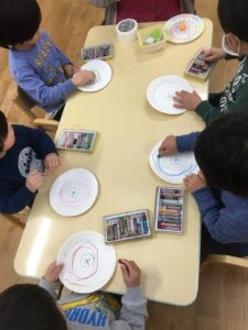午後のゆったり時間は、コマ作りをしました❣️紙皿に好きなように絵柄を描いて🖍
