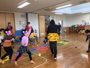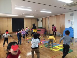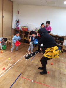 続いては、りす組のお友達❣️👹の気配を感じていたらしく、カラーボールを持って緊張した様子で待っていました🎾