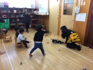 きりん組の教室は少し狭いので、至近距離で立ち向かい、奮闘💪