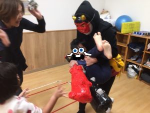 2日の療育クラブには、金棒を持った👹が園内を歩き回っていました😱