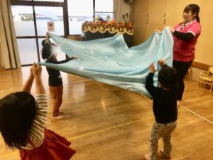 さらに、大布をみんなで持ってパタパタ揺らして、波を作ったり🌊