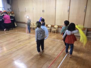 シフォン布を手に持ち、ピアノの音に合わせながら、様々な動きをしたり😀
