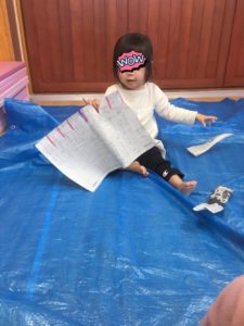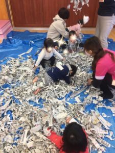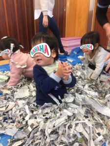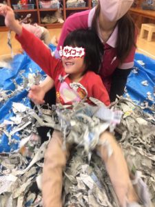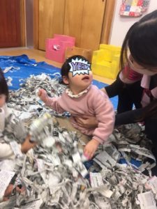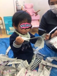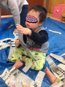 パラパラと降り注いだり、新聞紙にうもれたり🤣新聞紙の感触あそびをめいっぱい楽しむことができました(((o(*゚▽゚*)o)))♡