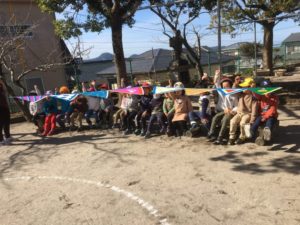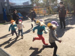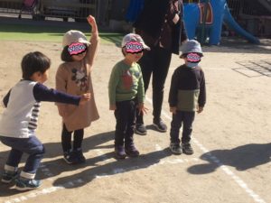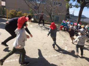 かけっこをして体が温まったらいおん組は、教室に戻ると、今度は、なべなべそこぬけ🎵