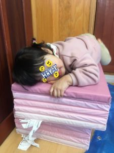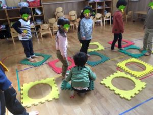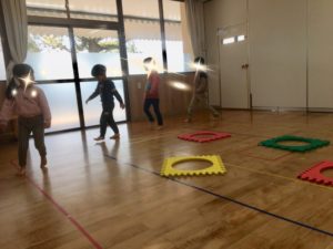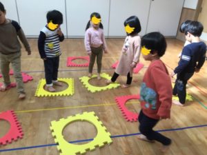 また、音楽が止まるとマットに入ったり、、陣取りあそびを楽しみました😀