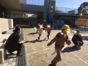 3日の朝、らいおん組とぱんだ組合同で、かけっこ大会をしました🏃♀️総勢16名の勇敢なお友達「えいえいおー」と気合い十分😄