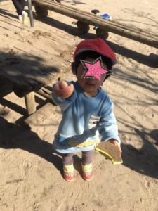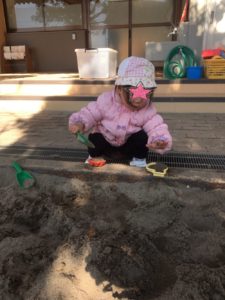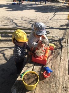 砂場で仲良くおままごとをするお友達や😀