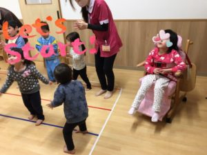 5日きりん組とくま組のお友達、元気よく🎶エビカニクス🦐のおゆうぎ スタート🤗