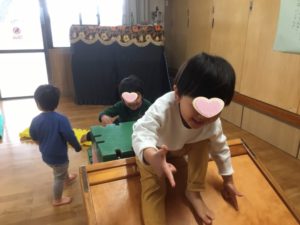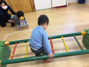 自由あそびは、はしご渡り💪以前は、はしごをつかむことも嫌がっていたお友達も、今ではしっかりと両手で掴めるようになり👏