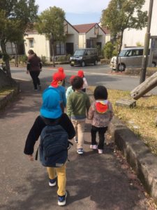 行き帰りの道のりでは、小学校に通う練習も兼ねて、リュクを背負って歩く年長のお友達❣️最後まで足取りしっかりと歩くことができていました👏