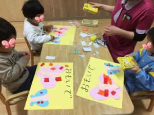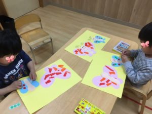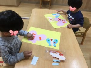 ノリの感触にも慣れて、ちょうちょの羽の模様を貼っていました👏