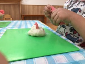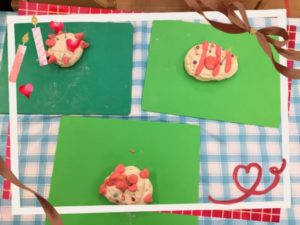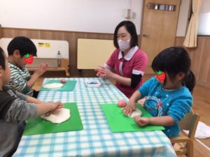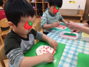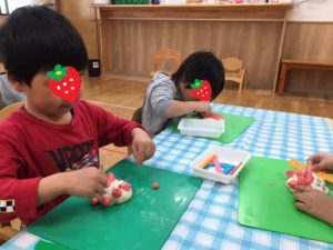 赤い小麦粉粘土はちぎっていき、いちごを作りました🍓粘土あそびをする前に、いちごケーキの模型を見たお友達は、イメージもかなり上がり、、