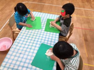 小麦粉粘土の感触を嫌がることなく、手のひらでしっかりとこねていきます😀