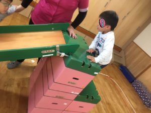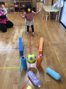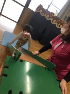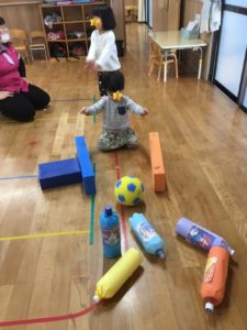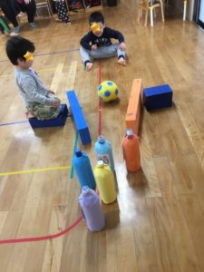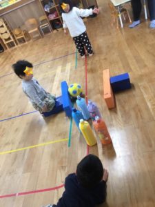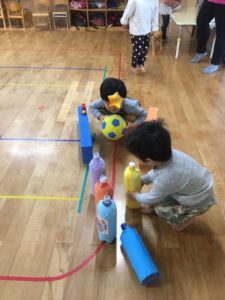 5日らいおん組の教室の自由あそび時間は、ペットボトルボーリングが登場🎳