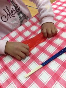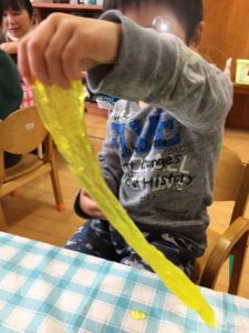 貼るノリではなく、洗濯のりにホウ砂を加えたスライムあそびをしていました😀好きな色でスライムを作って、、