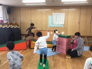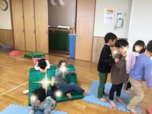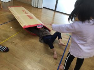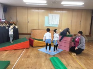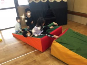 三角マットを繋げると、フワフワする状態を這うように移動したり😀みんな思う存分体を動かしてあそびました❣️