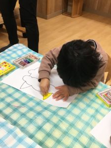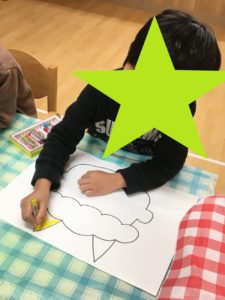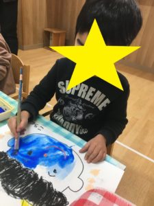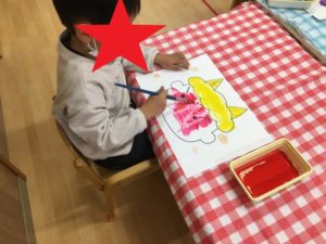 はじき絵(クレヨンで描いたところを絵の具ではじく)を活動に取り入れ、「枠からはみ出さずに色を塗る。」「はじき絵を楽しむ。」をねらいにおこないました。
