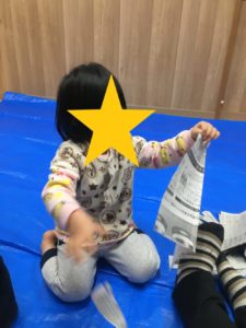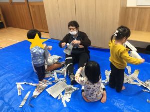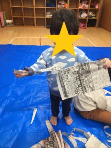 今日のきりん組さんは、新聞紙遊びをしました。