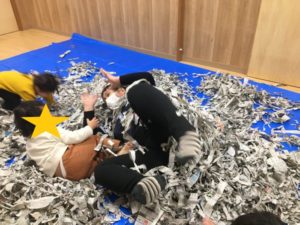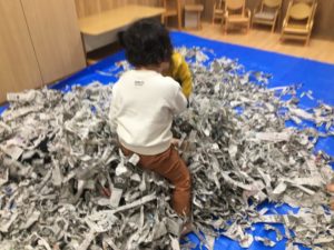 たくさん破った後は、大量の新聞紙で投げたりもぐったりして遊びました。自分から寝転がって、新聞紙をかけてもらうのを待っているお友だち、いっぱい抱えて上に投げるお友だち、遊び方はいろいろです。
