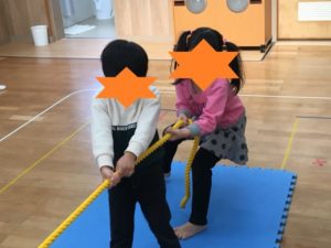 最初は綱を引く、踏ん張るを体の動きで知り、大人対こども2人で戦いました。