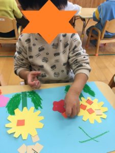 はさみも上手に持ち、かわいい菜の花とタンポポが出来上がりました♪