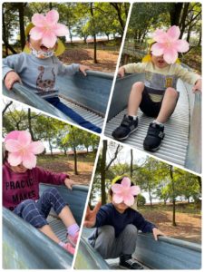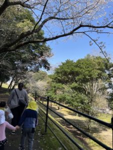 歩いていると道沿いさくらの花びらを見つけて春を感じながらのお散歩でした。少し新しくなった、チャレンジの森へ歩いて散歩に行きました。少し遠い公園でしたが、お互い手をつないで歩きました。