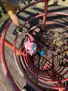 少し高い遊具に登っていました。恐々と足を前に出して、いろんな遊具を楽しんでいます。