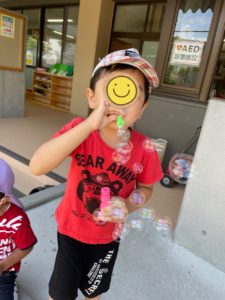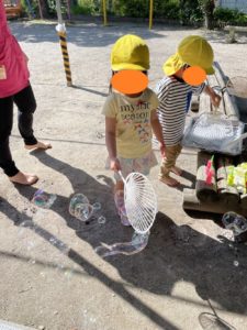 うちわを使ってシャボン玉を作って見せるとおおはしゃぎ!!