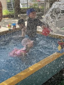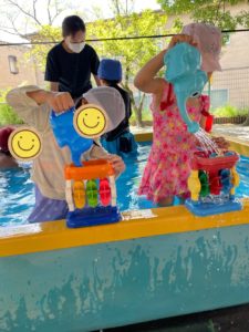 たくさんの水遊びをしていたせいか、顔に水がかかるのが平気になってくるお友達もふえていました。最後の時間は自分の好きな遊びをしています。