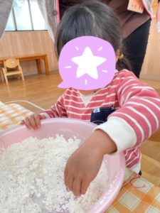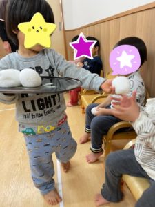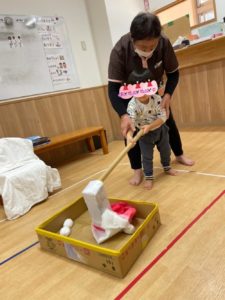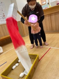 リズムよくつく動作を楽しんでいたお友達でした!ついたお餅を・・・