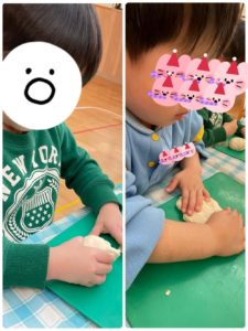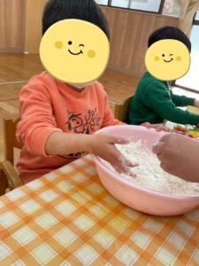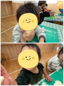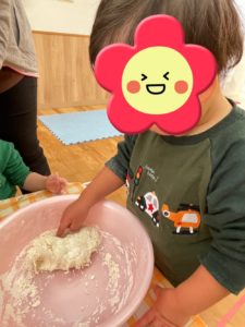 という事で、小麦粉粘土をみんなで作っていきました!粉の状態から水を加えて順番で混ぜていき、「なんかいい匂いがしてきた〜♪」と少しずつ形になっていく様子を楽しむ姿がありました★
