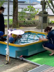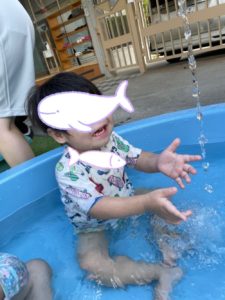 始めは、少し恐るおそる、プールの外から水を触るお友達。少しずつ慣れて水の感触を楽しんでいるお友達。