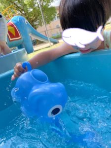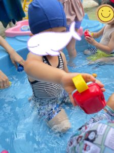 上手にじょうろなどのおもちゃでお友達にかけて挙げたりなど、水鉄砲などで遊んでいます。