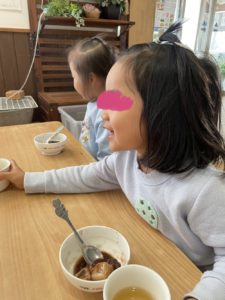 「わぁ~!ぜんざいだ~!!」と喜ぶこども達の声がしましたよ♪