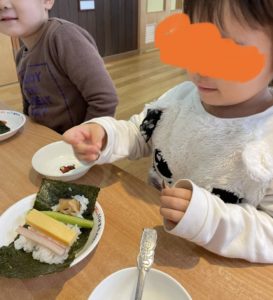 午後のおやつでは節分に食べる『恵方巻き』を提供しましたよ☆彡