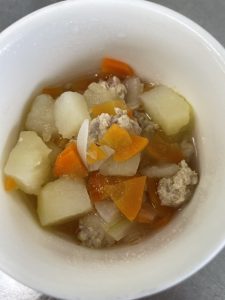 鶏ミンチを中心に、たまねぎ、にんじん、じゃがいもを柔らかくなるまでじっくり煮込んでいます。