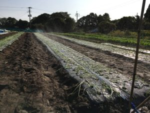 玉ねぎに設置した潅水チューブで水まきをしました!