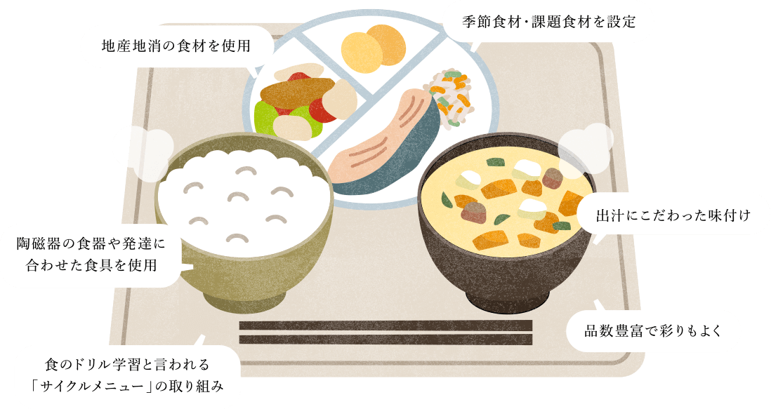食のドリル学習といわれる「サイクルメニュー」を提供しています。これは、一ヶ月間、曜日ごとに同じメニューを繰り返し食べて食材に慣れていき、味覚が育つ学習を得ることを目的としています。確実な栄養バランスと豊富な食材を取り入れ、素材本来の味を覚えていきます。